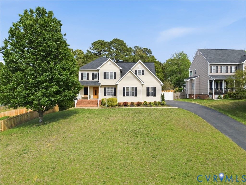 FIRST FLOOR PRIMARY Suite and 4 Car Garage (2 Car Attached Garage and a 2 Car Detached Garage (w/ a plywood subfloor on top of a concrete slab) with an electrical subpanel and tons of space). Tucked away in the quiet Summergrove neighborhood, this place is the perfect mix of move-in ready and plenty of space to breathe. A little backyard view of Cherrydale Pond. The interior boasts an inviting open-concept layout defined by warm hardwood flooring throughout the main level. The sun-drenched 2- story tall living room, centered around a cozy gas fireplace, flows seamlessly into the eat-in kitchen. Also off the family room is a dream come true FLORIDA room with laminate floors and ceiling fan/light. Culinary enthusiasts will appreciate the bar-height granite countertops, a full stainless appliance package updated in June 2023, and a charming bay window that overlooks the private rear grounds. For ultimate convenience, the spacious primary suite is located on the FIRST floor, featuring newer laminate flooring, a walk-in closet, and a spa-like en suite bath complete with double vanities, a corner jetted tub, and a separate walk-in shower. The second floor offers three additional generous bedrooms and a shared full bath, providing ample space for family or guests. One of the upstairs bedrooms includes a private attached office, making it the perfect setup for remote work or a quiet hobby room. Storage and utility needs are easily met with the attached garage, a detached garage/workshop (SO MUCH GARAGE SPACE and WORKSHOP), and an 8' x 10' tool shed. Outside, the backyard is an entertainer's dream, first you've got the four season sun room and then a fully enclosed yard by a 6-foot vinyl fence for maximum privacy. Ideally located just minutes from the shopping and dining along Route 360 and offering rapid access to I-295, this home perfectly combines convenience with a quiet neighborhood feel. New roof (2023) on the house, garage, AND shed, water heater (2024) and fresh shutters (2025). Vinyl Siding. Vinyl Windows.